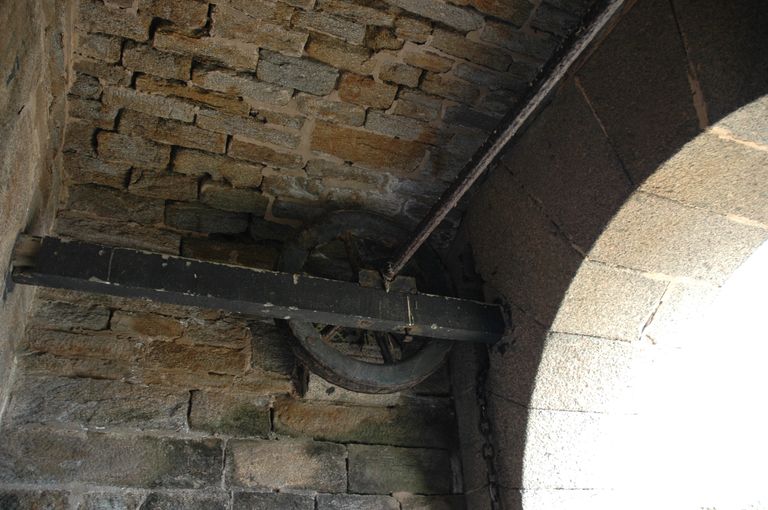 Vue du passage d'entrée : vestiges du pont-levis à contrepoids (état en 2004)Immatriculation