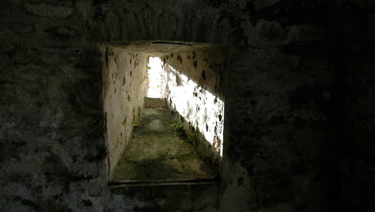 Vue intérieure : créneau de tir permettant la défense du fossé sec (état en 2004).Immatriculation