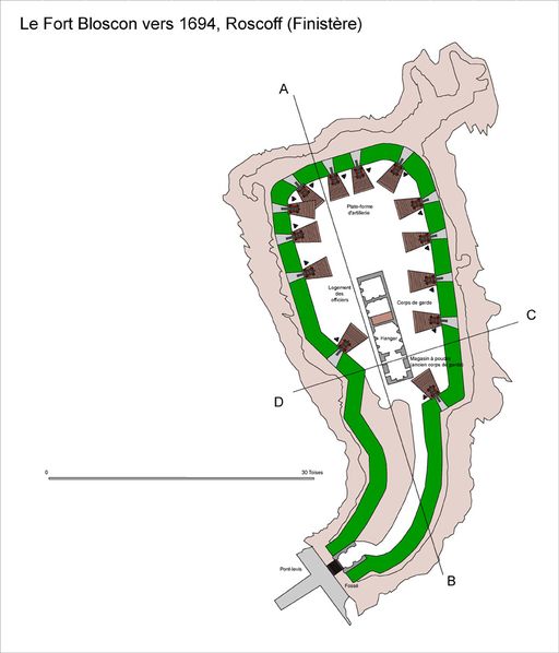 Plan du fort Bloscon vers 1694 (dessin : (dessin : Guillaume Lécuillier d'après Poictevin le Jeune de la Renaudière). Le fort compte treize plate-formes d'artillerieImmatriculation