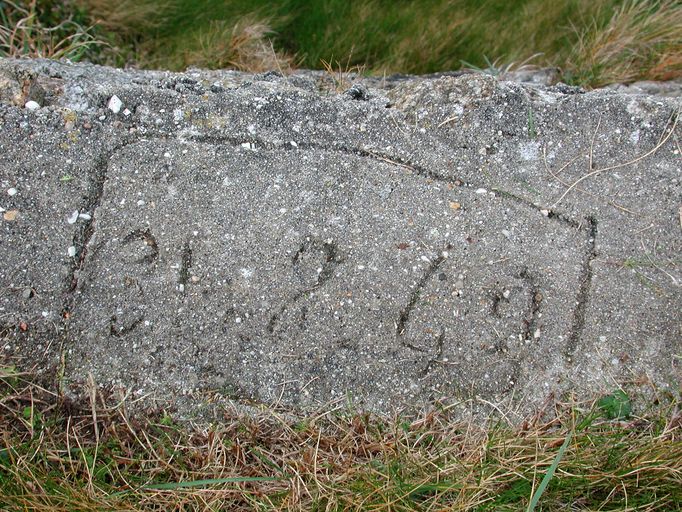Vue d'un millésime tracé dans le béton frais : 31-8-43 situé près du bunker - casemate de type 611 du Fort Bloscon (état en 2004)Immatriculation