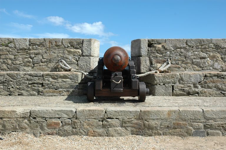 Vue de l'embrasure débouchée et mise en valeur par une pièce d'artillerie sur affût de marine (état en 2004)Immatriculation