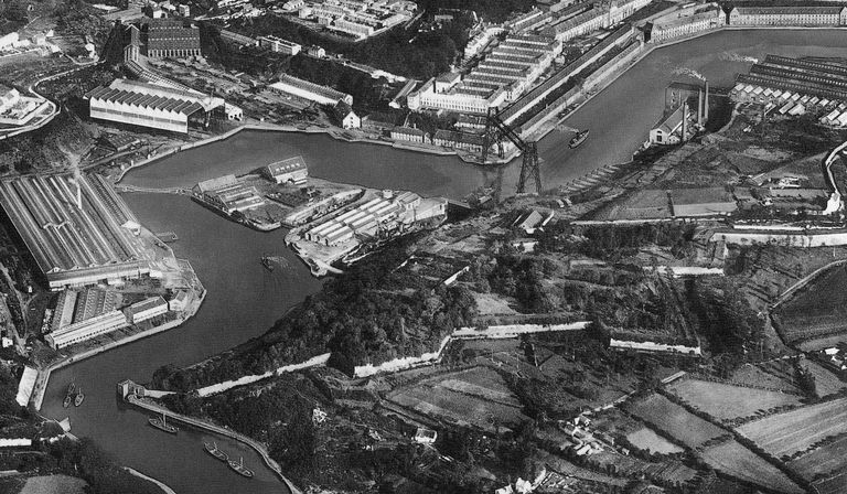 Vue aérienne Nord-Sud de l'arsenal de Brest en 1926. Au centre de l'image : l'ouvrage à cornes de QuéliverzanImmatriculation