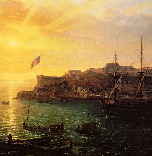Vue de la rade de Brest, prise au bas de la batterie du château. La batterie basse du fer à cheval côté Recouvrance : détail du tableau de Jean-François Hue conservé au SénatImmatriculation