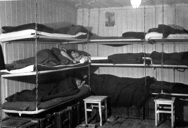 Image d'illustration de la vie quotidienne dans les ouvrages du Mur de l'Alantique : la chambrée dans un bunker de l'Armée de Terre (collection particulière). Les tabourets servent à monter dans la couchette supérieureImmatriculation