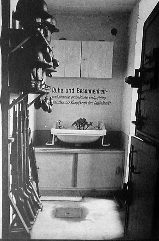 Image d'illustration de la vie quotidienne dans les ouvrages du Mur de l'Alantique : entrée d'un abri à personnel, ratelier d'armes, évier (collection particulière)Immatriculation