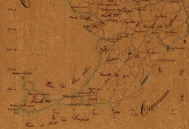 Extrait du tableau d'assemblage de la commune de Ploumoguer (comprenant alors les Blancs Sablons et la presqu'île de Kermorvan), 1840Immatriculation