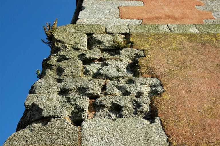 Vue de la Tour Vauban : impacts de boulets sur la face occidentale de la tour (une trentaine d'impacts sur 2 mètres carrés)Immatriculation