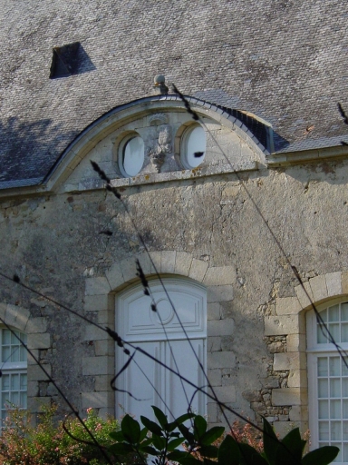 Façade sud, détail fronton et armoiries sculptées.Immatriculation