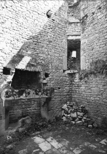 Ancien logis, vue intérieure prise du nord-ouest, cheminée au nord de la salle du RDC. Etat en 1978.Immatriculation