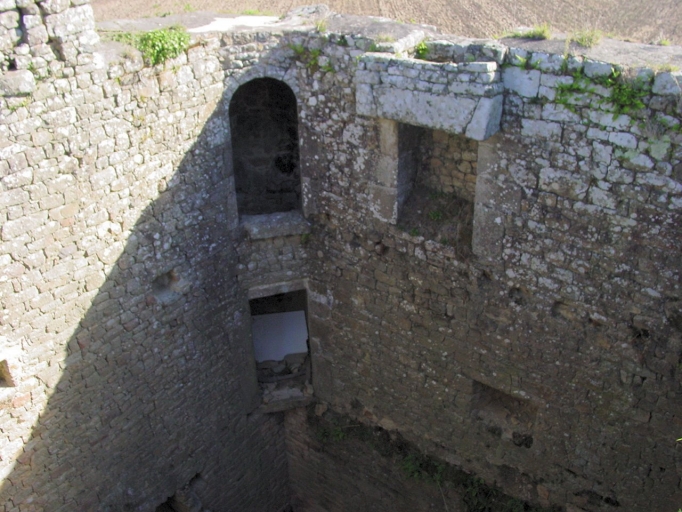 Ancien logis, vue intérieure vers le nord-est : 1er et second étages, ouvertures vers le corps de latrine, et cheminée est.Immatriculation