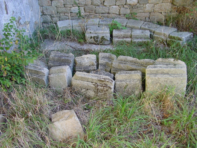L'orangerie, vestiges d'un fronton de l'une des baies déposés au pied de la façade sud.Immatriculation