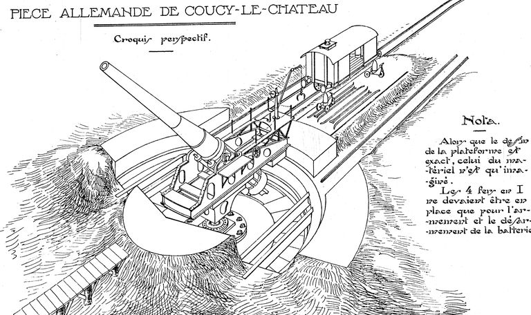 1917 dans l'Aisne, Coucy-le-Château-Auffrique : croquis perspectif de l'encuvement de la Grosse Bertha. Un des premiers blockhausImmatriculation