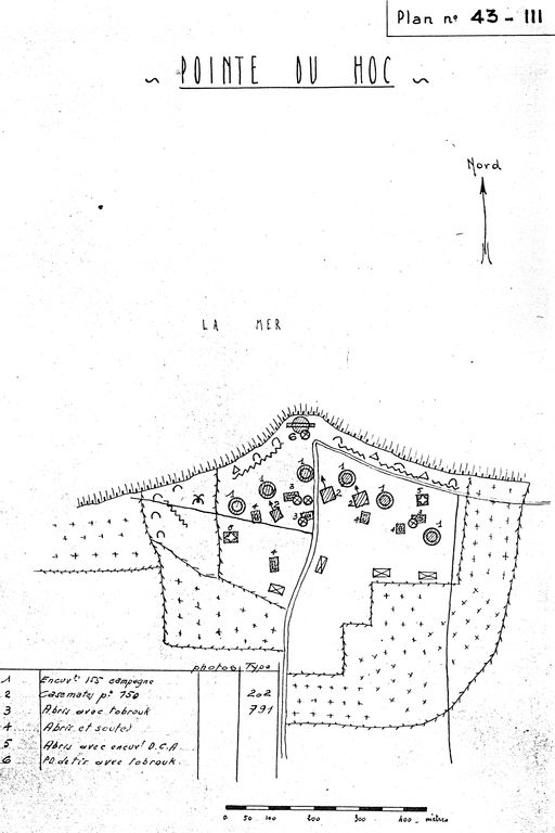 Plan de la batterie de la pointe du Hoc (n° 43 III), rapport Pinczon du Sel, vers 1946-1947, Service Historique de la Marine, VincennesImmatriculation