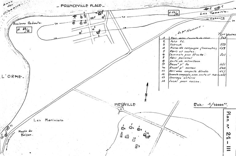 Plan de l'ensemble fortifié de Franceville-Plage et de la batterie de Merville (plan n° 21, III), rapport Pinczon du Sel, vers 1946-1947, Service Historique de la Marine, VincennesImmatriculation