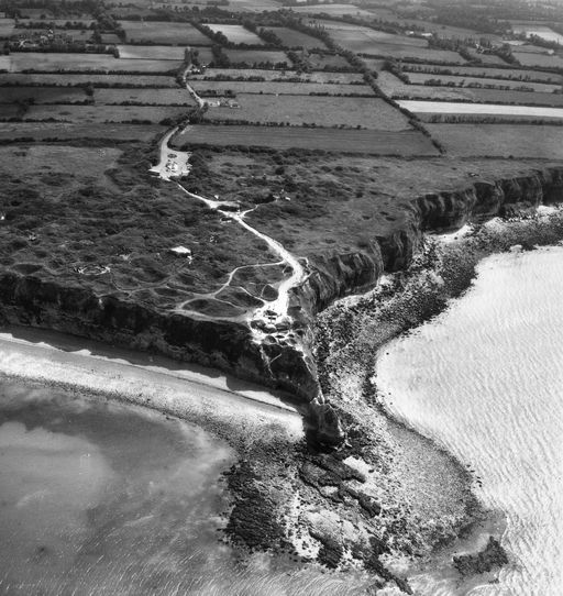 Vue aérienne oblique de la pointe du Hoc : casemates, poste de directions de tir et nombreux cratères. (C. R. D. P. Caen)Immatriculation