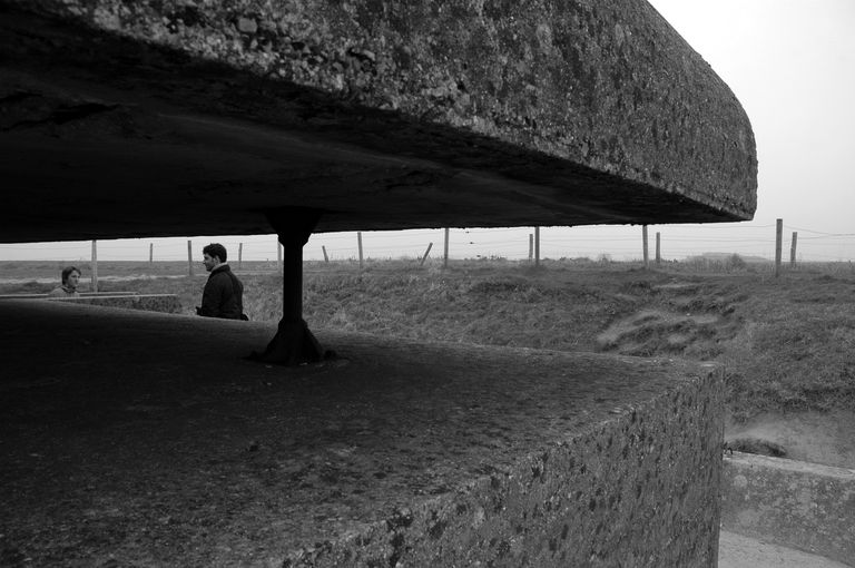 Vue du poste de direction de tir de la batterie de Longues-sur-Mer : détail de la dalle de couverture de l'observatoireImmatriculation
