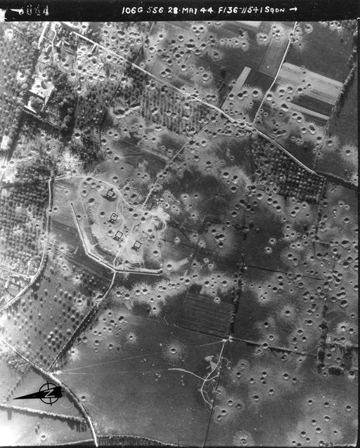 Vue aérienne verticale de la batterie de Merville, 28 mai 1944. (Ministry of Defense, Air Force Departement Photograph, Université de Keele)Immatriculation