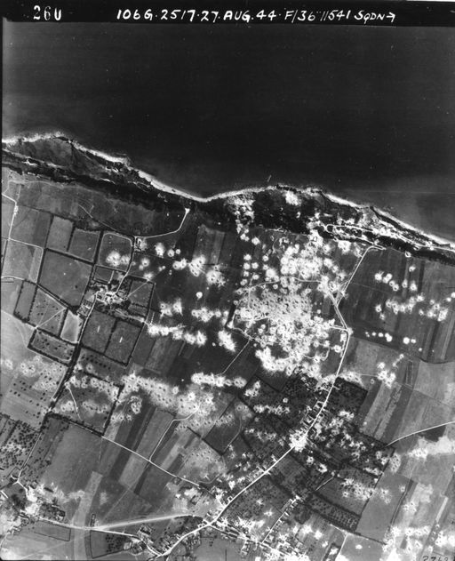 Vue aérienne verticale de la batterie de Longues-sur-Mer après de nombreux bombardements, 27 août 1944. (Ministry of Defense, Air Force Departement Photograph, Université de Keele).Immatriculation