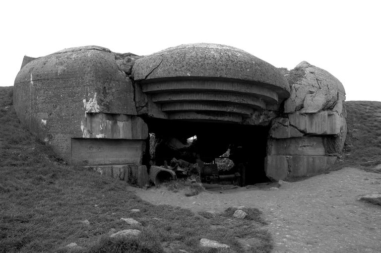 Vue générale de l'une des quatre casemates de la batterie de Longues-sur-Mer (casemate est en partie ruinée)Immatriculation
