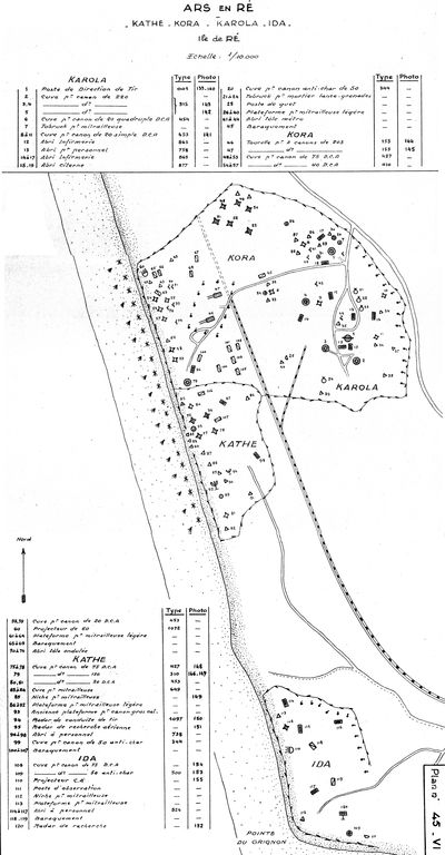 Plan de l'ensemble fortifié Kathe, Kora, Karola, Ida à Ars-en-Ré (plan n° 45, VI), rapport Pinczon du Sel, vers 1946-1947, Service Historique de la Marine, VincennesImmatriculation