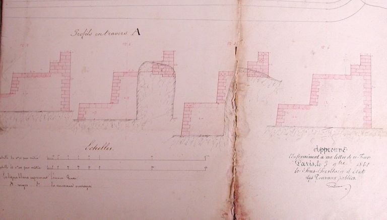 Plan, profils : projet de construction d'une cale de débarquement et d'un parapet, 1841 (AD 22)Immatriculation