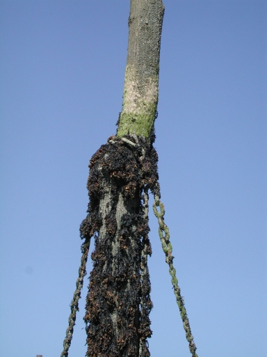 Détail d'amarrage des chaînes, faisant office d'aussière fixe, en haut d'un pieuImmatriculation