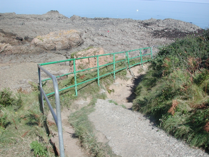 Vue de la descente aménagée de la falaise jusqu'au port de Gwin-ZégalImmatriculation