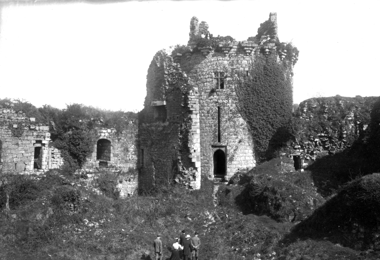 Vue de la tour d'Acigné depuis l'ouest (collection : Villard). Cette tour était dotée d'un pont-levis. A gauche, les vestiges du logisImmatriculation