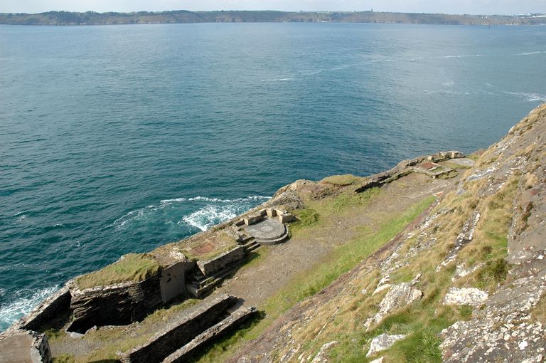 Vue générale de la batterie de l'îlot des Capucins. Derrière le parapet grossier en schiste, on distingue trois plateformes bétonnées pour canon dont deux similaires pour un canon G de 95 mm de côteImmatriculation