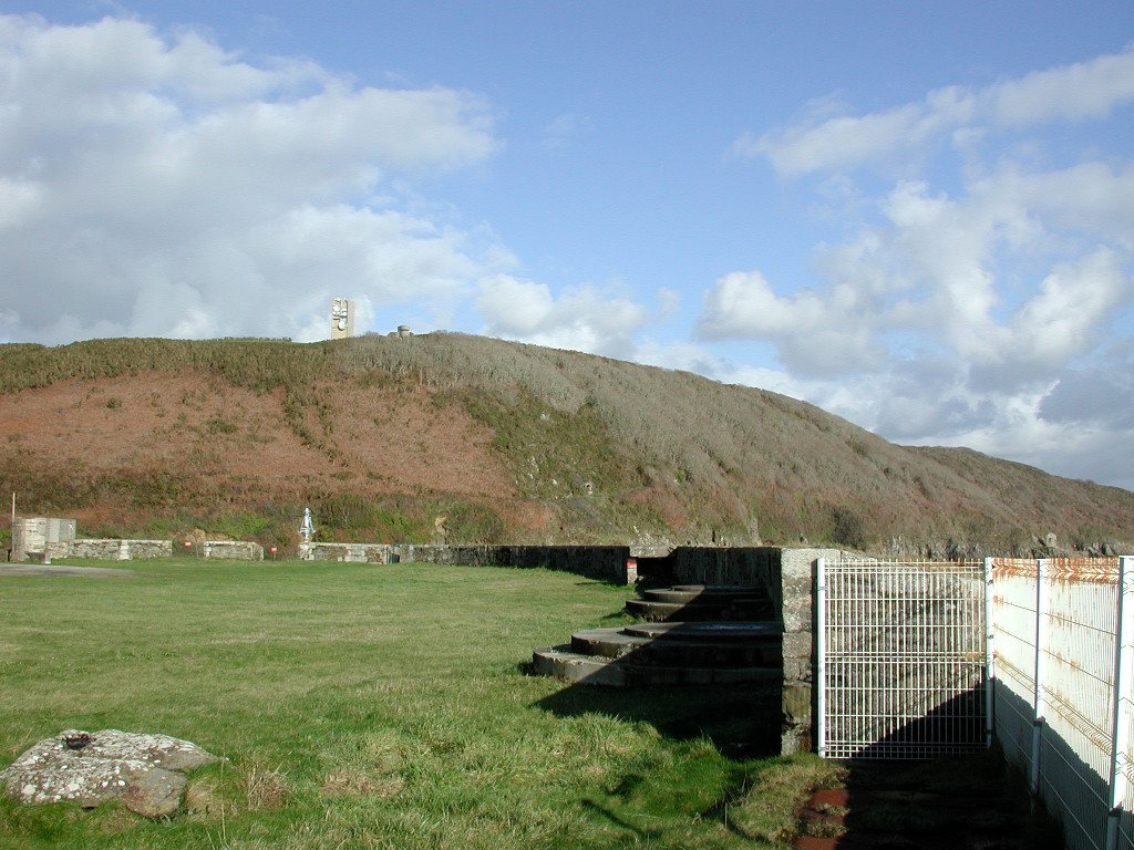 Vue de la plate-forme de la batterie basse du Mengant : ensemble de deux plate-formes en béton pour canon (état en 2003). Sur la hauteur, la tour de mesures de KerdalaezImmatriculation