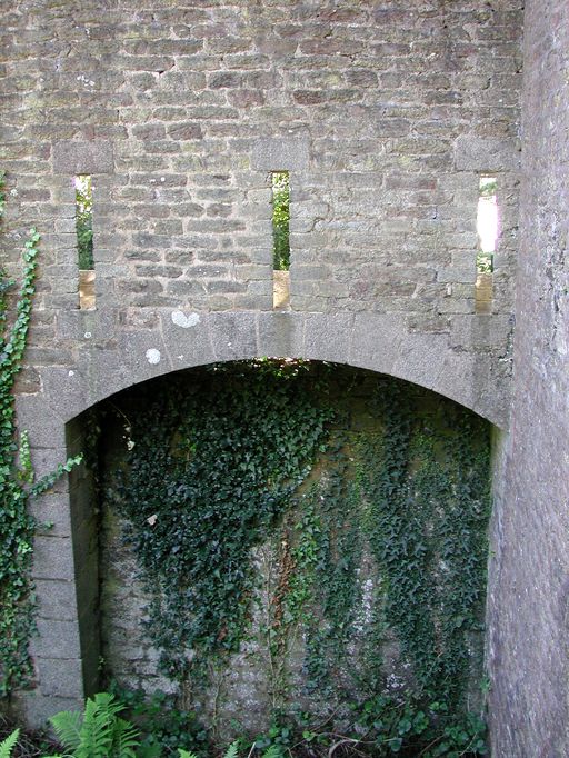 Vue du fort du Dellec : mur d'enceinte est. Mâchicoulis sur arc défendant le fossé sec sous le pont-levisImmatriculation