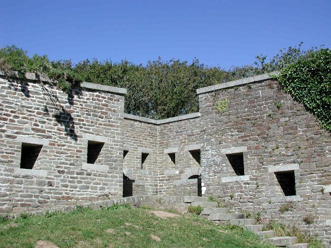 Vue du fort du Dellec : mur d'enceinte ouest percé de créneaux de fusillade. Bastionnet à mâchicoulis ou créneaux de piedImmatriculation