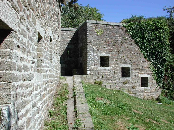 Vue du fort du Dellec : mur d'enceinte ouest percé de créneaux de fusillade. Bastionnet à mâchicoulis ou créneaux de piedImmatriculation