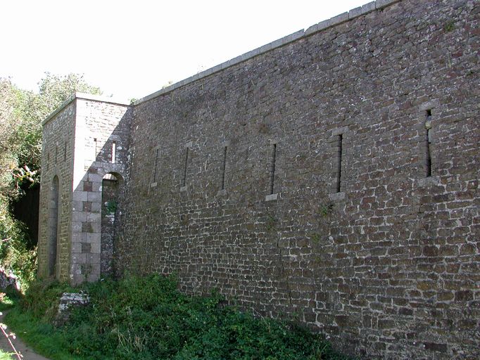 Vue du fort du Dellec : fossé sec flanqué par un bastionnet percé de créneaux de fusillade et doté de mâchicoulis ou créneaux de piedImmatriculation