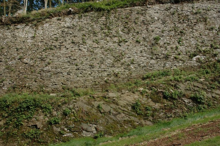 Vue de l'ouvrage à cornes de Quéliverzan : escarpe ancré sur le rocherImmatriculation