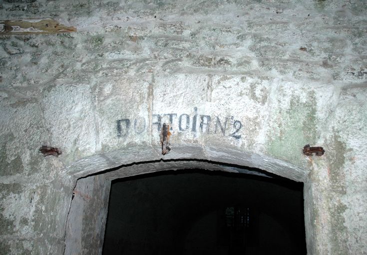 Vue du fort de Penfeld : les casernements, inscription DORTOIR N°2 située au dessus de l'entrée d'un des grands casernementsImmatriculation
