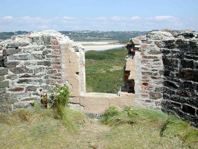 Vue du réduit de batterie de côte de l'île de l'Aber : terrasse, parapet percé d'embrasures et de créneaux de fusilladeImmatriculation