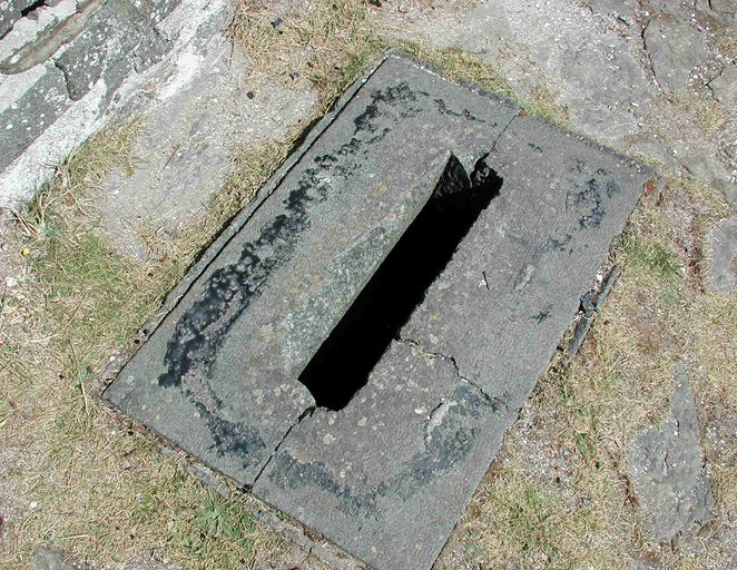 Vue du réduit de batterie de côte de l'île de l'Aber : terrasse, créneau de fusillade vertical type assomoir (dispositif de défense de l'entrée)Immatriculation