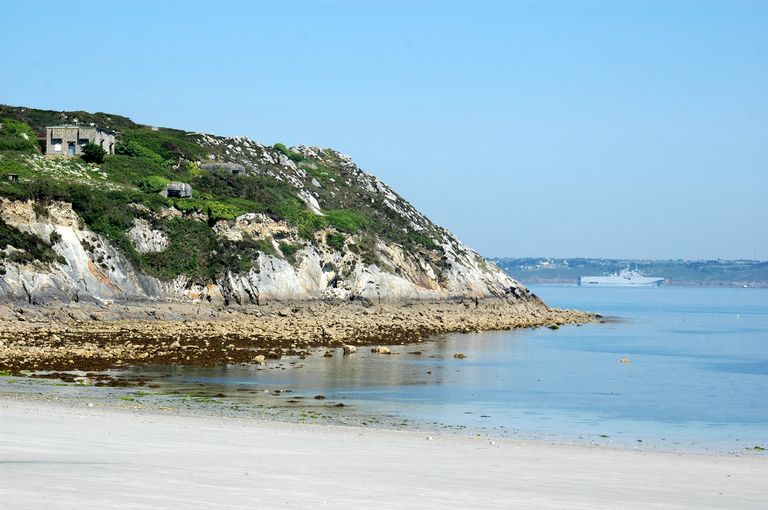Vue de la pointe du Petit Gouin depuis l'anse de Camaret : corps de garde crénélé et batterie sous bunkers - casemates de type 671 (2 x 7,5 cm)Immatriculation