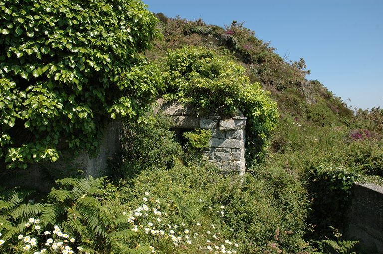 Vue de la guérite d'observation en maçonnerie de moellon située au niveau de la batterie de côte (état en 2005). Elle est envahie par la végétationImmatriculation