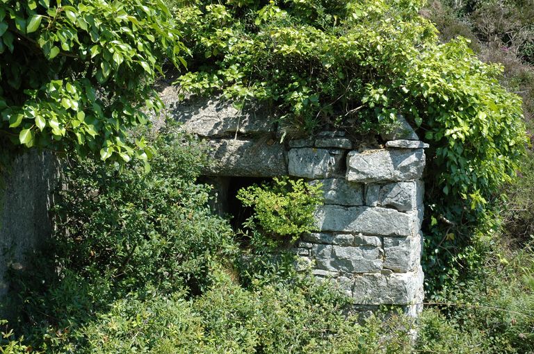 Vue de la guérite d'observation en maçonnerie de moellon située au niveau de la batterie de côte (état en 2005). Elle est envahie par la végétationImmatriculation