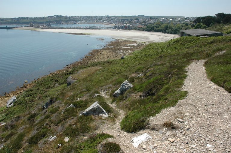 Vue du sentier côtier dominant le réduit de batterie de côte du Petit Gouin et les batteries de côte coiffées de deux bunkers - casemates de type 671 (état en 2005)Immatriculation