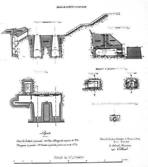 Plan et coupes de la batterie casematée, 1893 (Direction d'Artillerie du génie de Brest, colonel Directeur d'Artillerie Collomb)Immatriculation