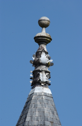 Ancien épi de faîtage au sommet de la toiture du porche (état de 2005). Un nouvel épi est apposé sur le porche après restauration en 2020.Immatriculation