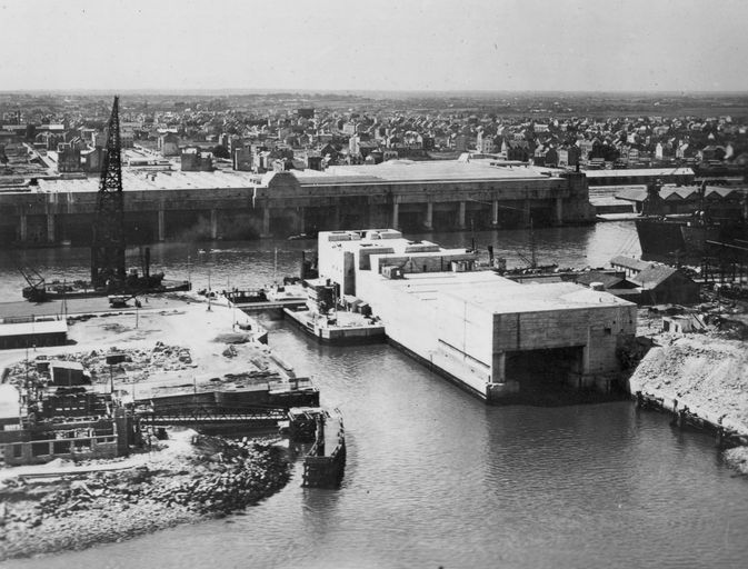 Vue aérienne de la base de sous-marins de Saint-Nazaire, au premier-plan : l'écluse bétonnée, rapport Pinczon du Sel, vers 1946-1947, Service Historique de la Marine, VincennesImmatriculation