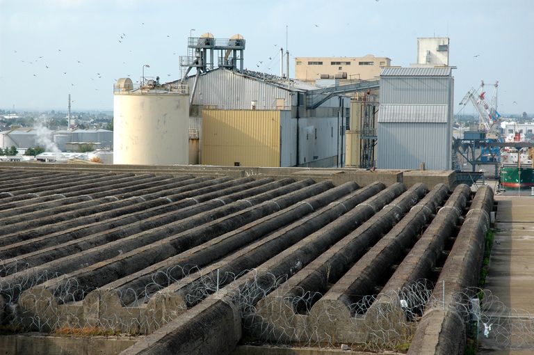 Environnement industrialo-portuaire de la base de sous-mains de Saint-Nazaire depuis la terrasse. Au premier plan, la structure de type FangrostImmatriculation