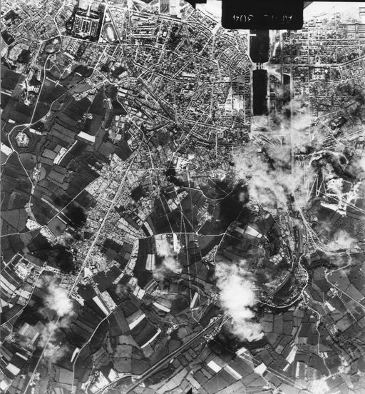 Vue aérienne verticale de la ville de Cherbourg, 9 mai 1944. (National Archives of Canada, Alfred Hown Photography, Can. D 8657 exp. 5056 et 5057, échelle 1/16 000)Immatriculation