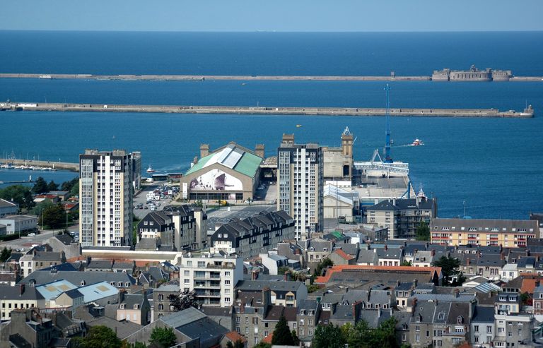 Panorama sur la ville de Cherbourg et la rade-abri depuis le Fort du Roule : la Gare Maritime inaugurée en juillet 1933 est devenue la Cité de la MerImmatriculation