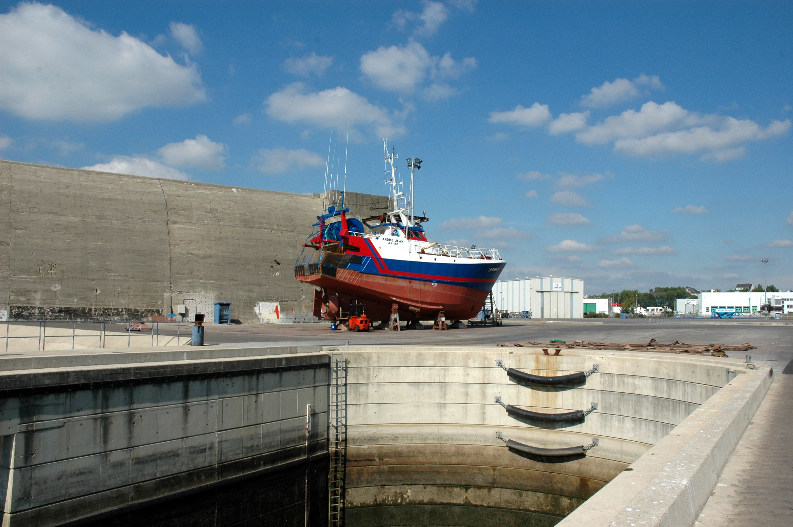 Vue de situation depuis le sud-est (2005). Au premier plan, le quai - à marée basse - servant à l'élévateur à bateaux. Au centre sur le terre-plein, le chalutier "André Jean" de LorientImmatriculation