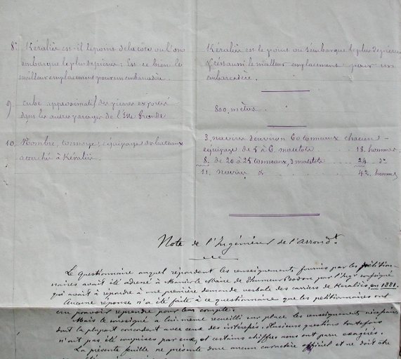 Questionnaire élaboré en 1881 pour la création d'un port à Keralies (2ème page) et note de l'ingénieur (AD 22)Immatriculation